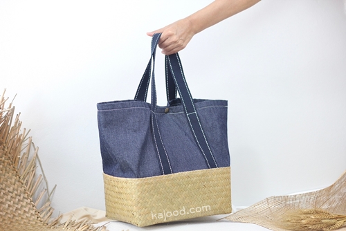 ตะกร้ากระจูด สีธรรมชาติ เย็บผ้าสียีนส์ครึ่งใบ